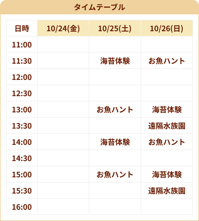 ※混雑状況などにより、開催内容が変更になる場合がございます。予めご了承ください。