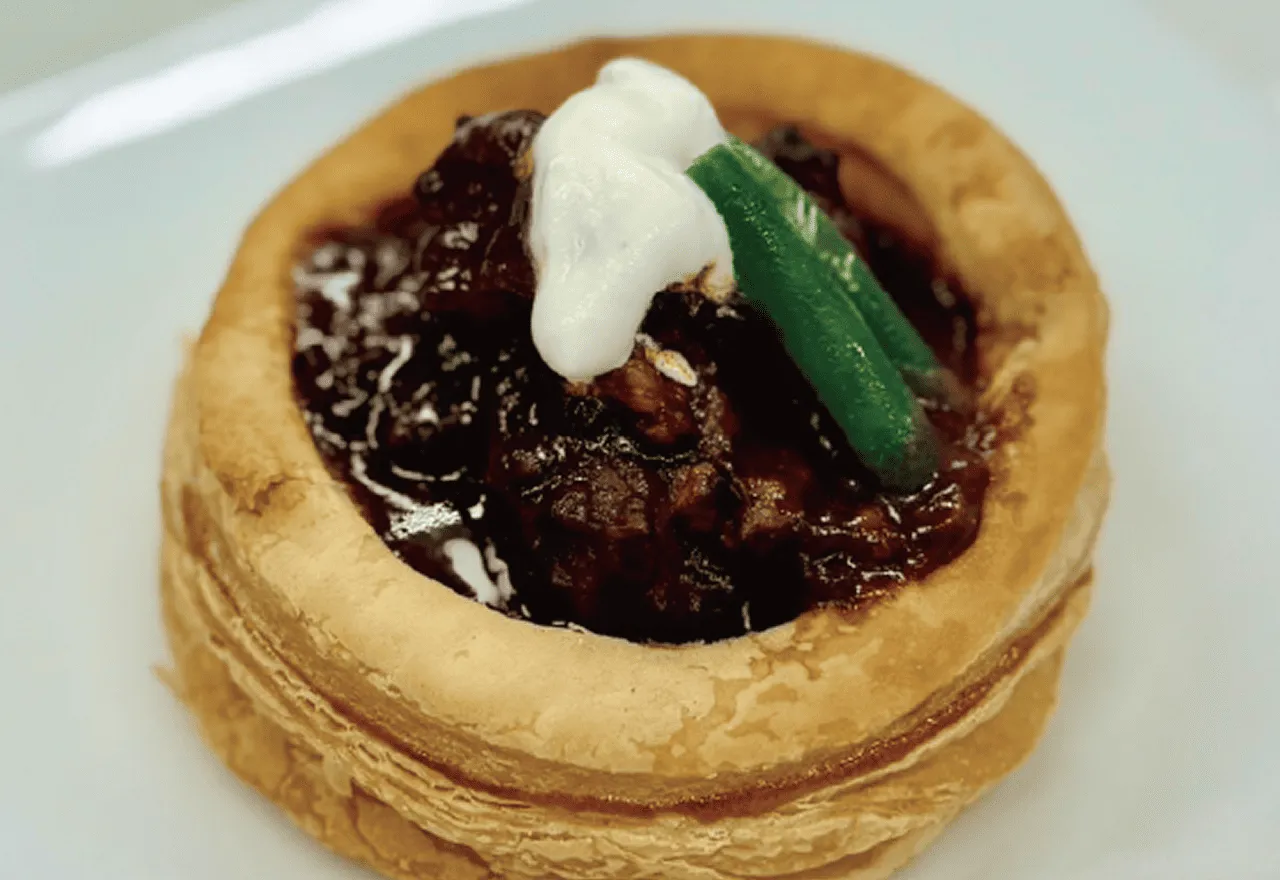 日本ジビエ振興協会代表理事でオーベルジュ・エスポワールのオーナーシェフ藤木シェフが鹿肉をじっくりと煮込み、軟らかく仕上げたシチューと相性抜群の治助イモのマッシュポテトを合わせたパイです。食材の旨味とパイの食感をお楽しみください。
